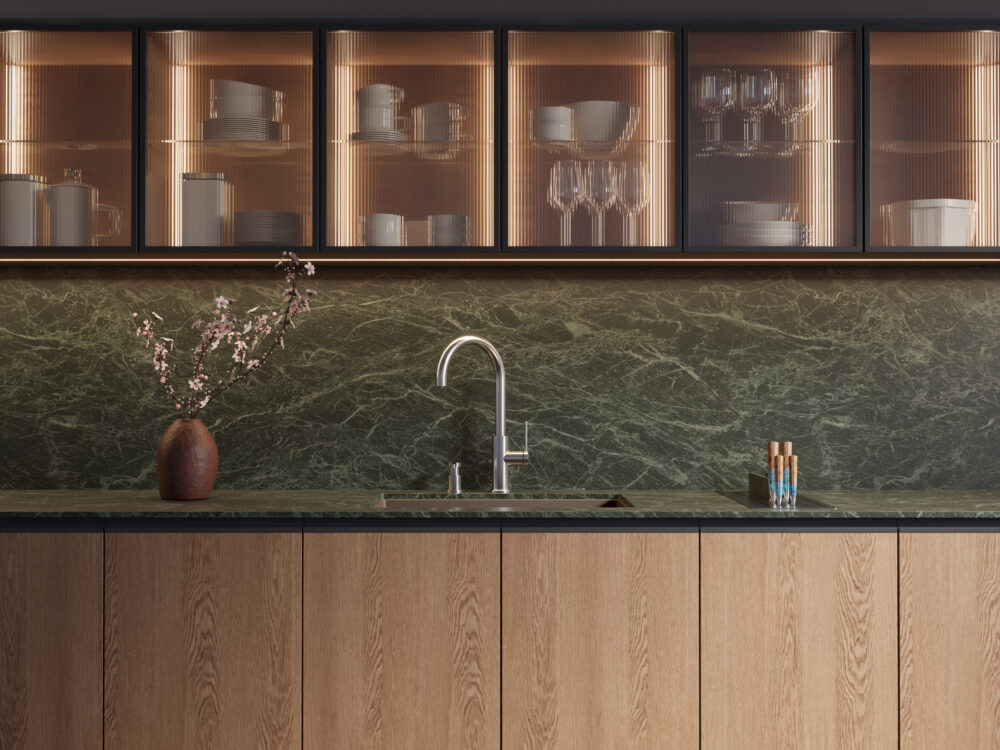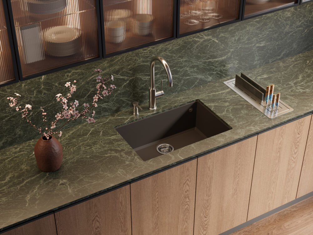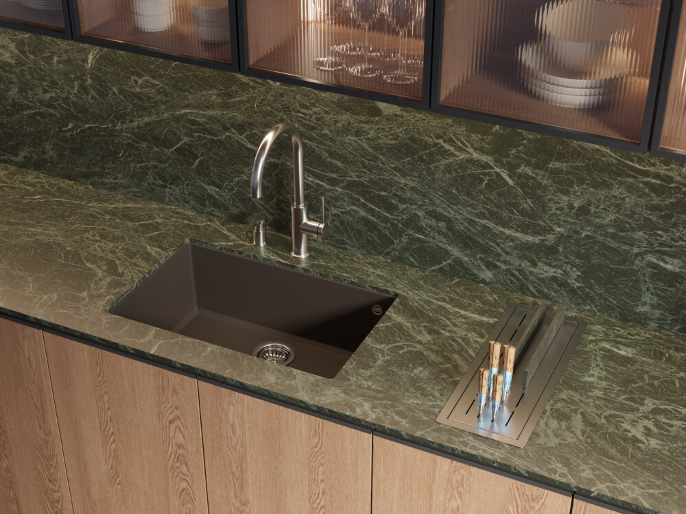 Компактную модель DRY-04 можно разместить в столешнице стандартной глубины 600 мм по правую или левую сторону от мойки, обеспечивая максимальную гибкость планировки. Это позволяет рационально использовать пространство и создавать удобную рабочую зону.