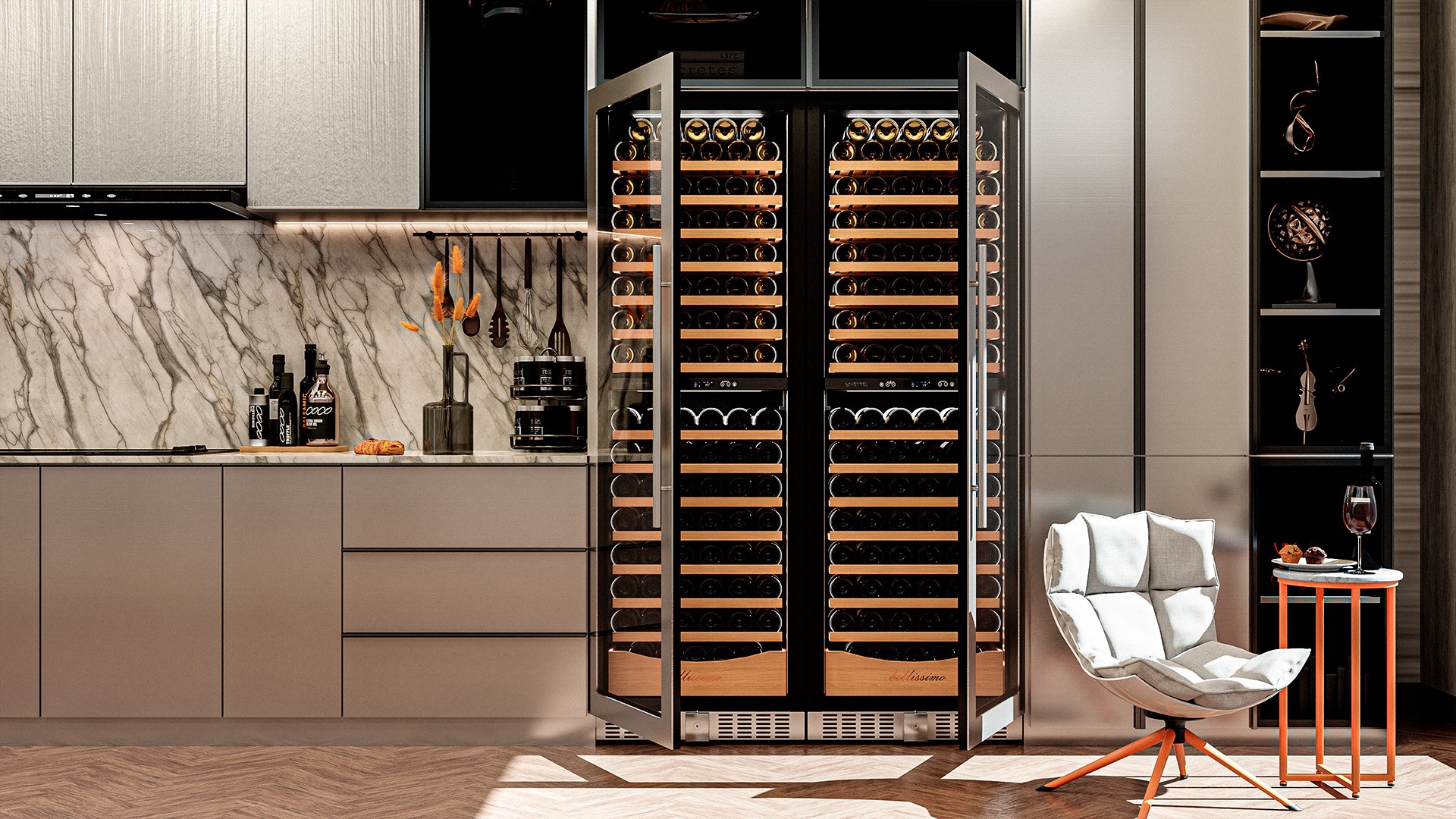 - Панорамное освещение для максимальной демонстрации винной коллекции;